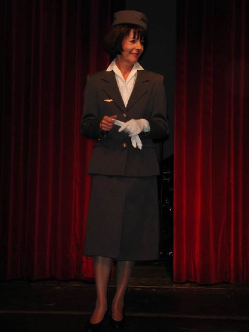 Die Hostessen mussten zu Fuss über den Tarmac zum Flugzeug marschieren und da war das leichte Chiffon-Tuch hilfreich, das den Hut auf demhochtoupierten Haar festhielt. Eine Neuheit war die hellblaue Bluse aus Nylon - formschön und pflegeleicht, da sie unterwegs ausgewaschen werden konnte und nicht knitterte.